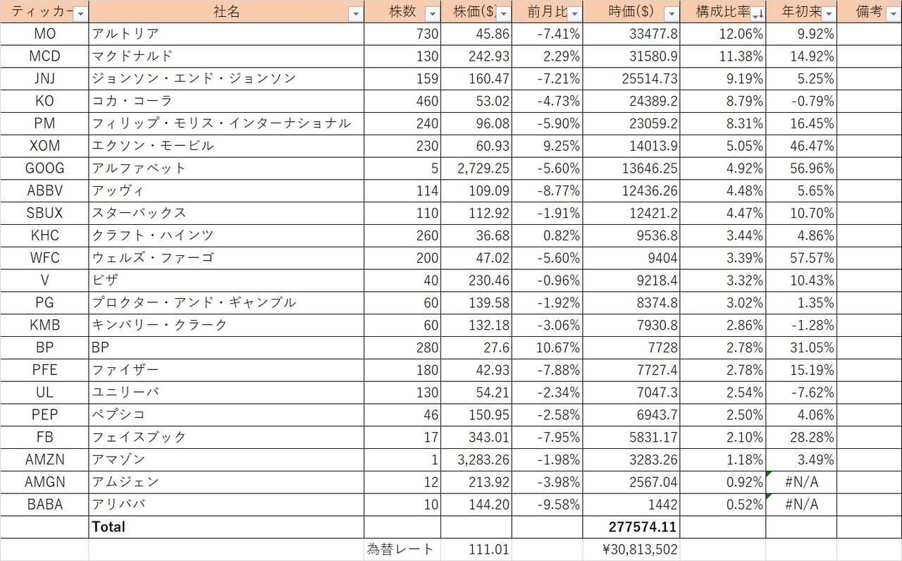 2021年9月末のポートフォリオです。時価総額はおよそ3080万円で、前月比-70万円でした。