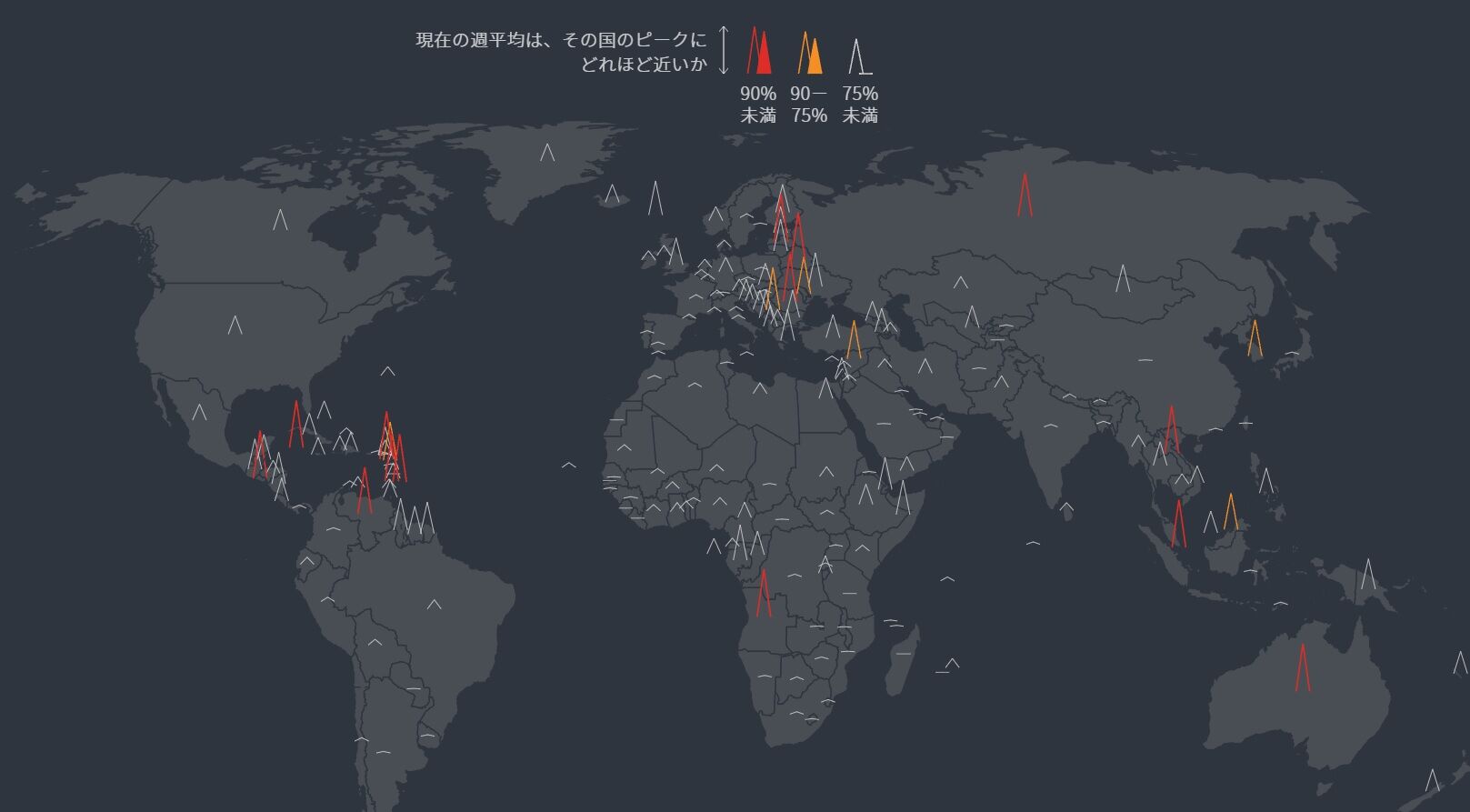 世界のコロナ感染者は減ってきています。以下は世界各国のピークとの比較ですが、ピーク時から感染が大分減った国が多いです。