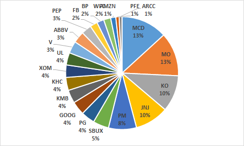 10月は全体的に下落しました。特に下落したのはキンバリー・クラーク(KMB)です。生活必需品銘柄であるだけに今のコロナ禍において好業績が期待されていましたが、Q3決算の内容が悪く、大幅下落しました。ビザ(V)も決算の内容が悪く、売られました。逆にアルファベットはQ3決算が良かったので値上がりしています。他はぼちぼちですかね。