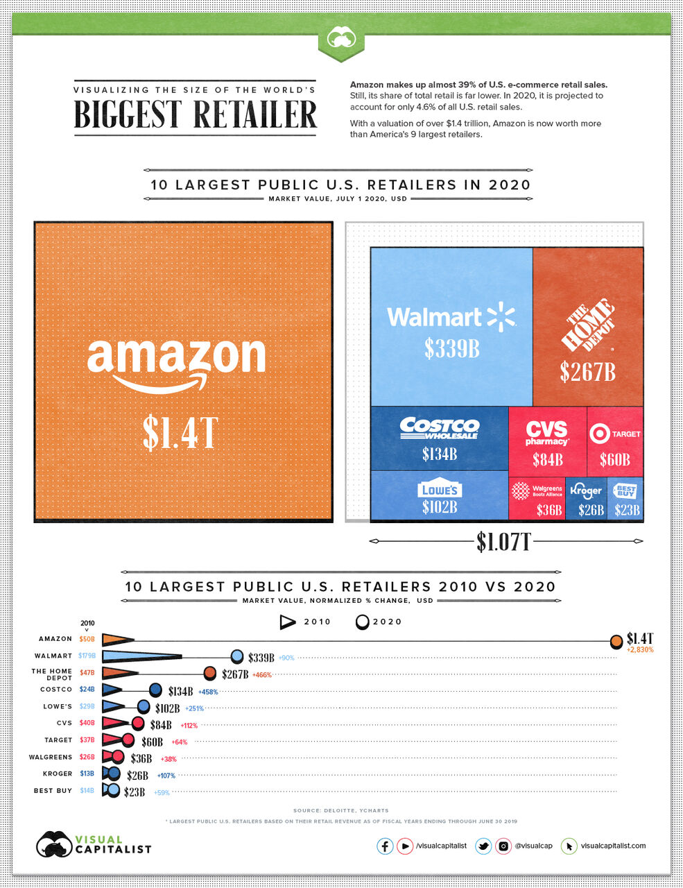 「ラジオスターの悲劇(Video Killed the Radio Star)」という有名な曲がありますね。テレビの出現により仕事を奪われた歌手の話だそうです。チャーリー・マンガーは消えた産業としてデパート、新聞、スチールをあげています。そうした衰退産業に取って代わった新興産業では、売上高は毎年大きく伸びていくでしょう。1-3. マーケットシェア拡大を産業をまたいで行っているとも言えます。思い浮かぶ企業と言えば、やっぱりアマゾンでしょうか。米国の小売業界で猛威を振るっています。