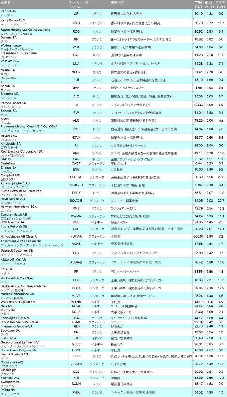 Euroozone Dividend Investingというサイトに、配当を20年以上維持または増配しているユーロ圏+スイス+デンマーク+スウェーデンの企業がまとめられています(英国は別枠)。