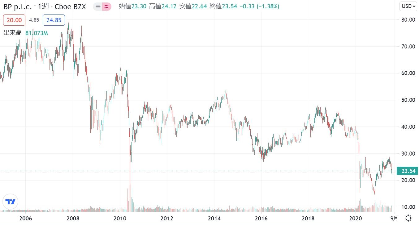 上はBPの10年チャートです。2010年頃に暴落しているのが原油流出事故によるものです。